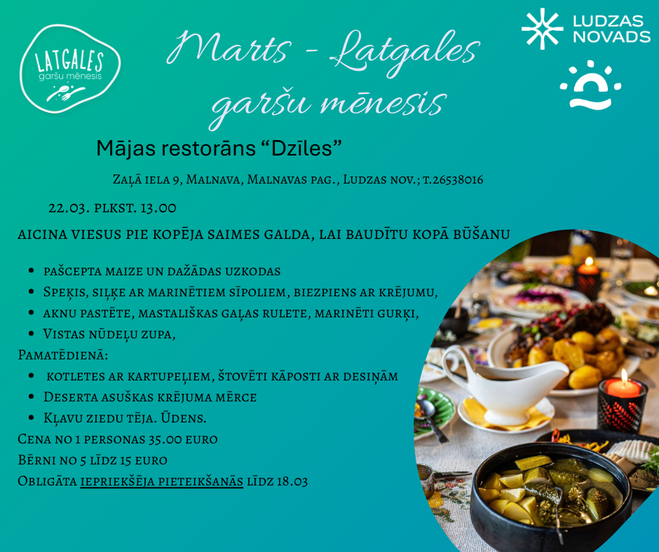 Latgales garšu mēnesī mājas restorāns Dzīles aicina viesus 22.03 plkst 13.00 pie kopēja saimes galda, lai baudītu kopā būšanu. Galveno uzsvaru liekam – tā mēs te ēdam. Latgaliskās garšas mūsdienu galdā.
